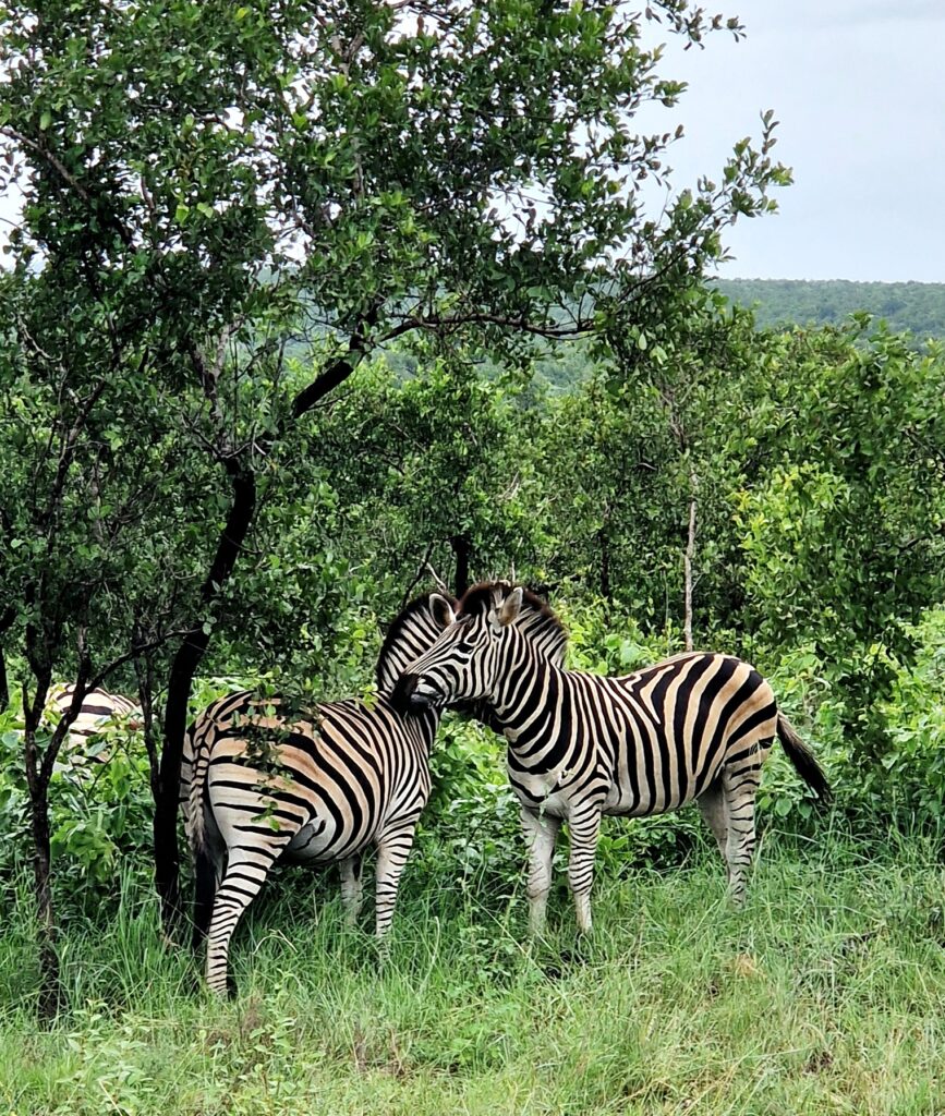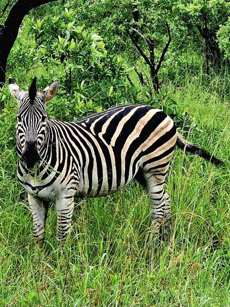 Vår första bekantskap med djuren i parken blir zebror och de är ju så vackra. Det finns ingen exakt siffra på hur många zebror som finns i Krugerparken men uppskattningsvis lever det cirka 30 000. Den art som lever i Kruger är stäppzebra, som är den vanligaste zebran i Afrika. I Krugerparken är de relativt vanliga och ses ofta i flock på savanner och öppna gräsmarker, särskilt i de södra och centrala delarna av parken.