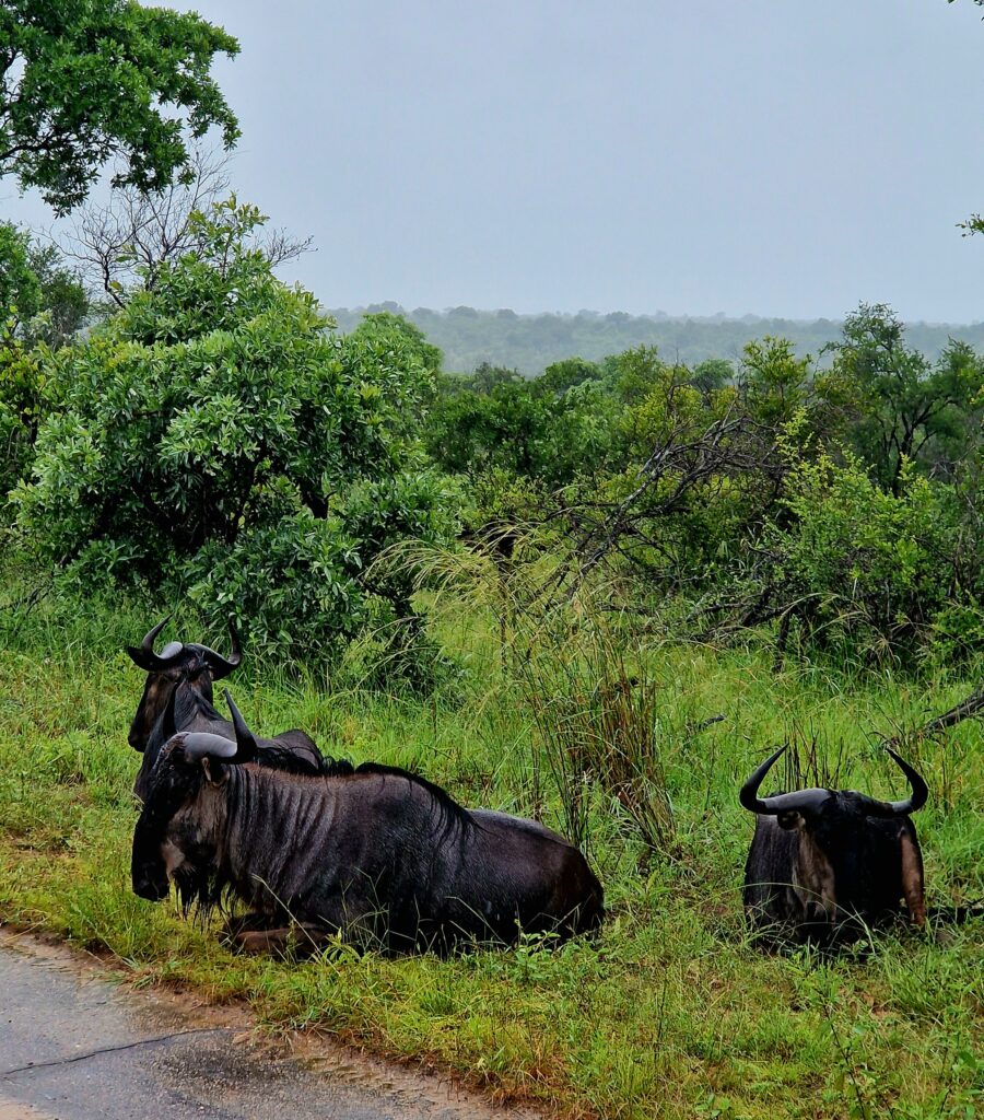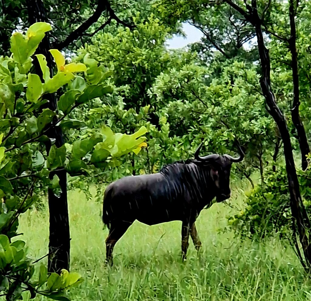 Ett annat djur vi ser mycket av är gnun eller wildebeest. Den tillhör de vanligaste djuren i Kruger och vi ser den då och då utmed dikeskanten. Gnun har ett lite säreget utseende med sin kraftiga framdel, smalare bakdel, böjda horn och ett skägg under hakan. Trots sitt tunga intryck är den snabb och uthållig.
