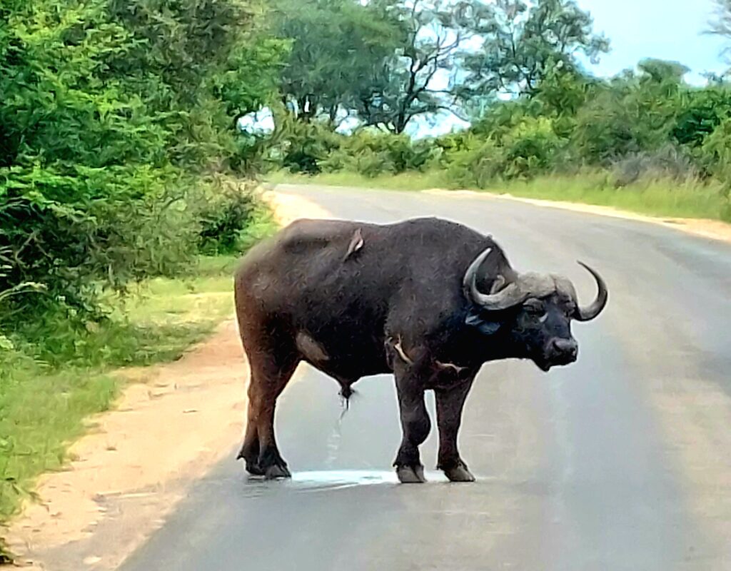 Vårt tredje djur av The Big Five är en buffel. Vid vårt besök var det ganska svårt att få syn dem, men den här buffeln lyckas maken fånga på bild när den står på vägen och kissar.