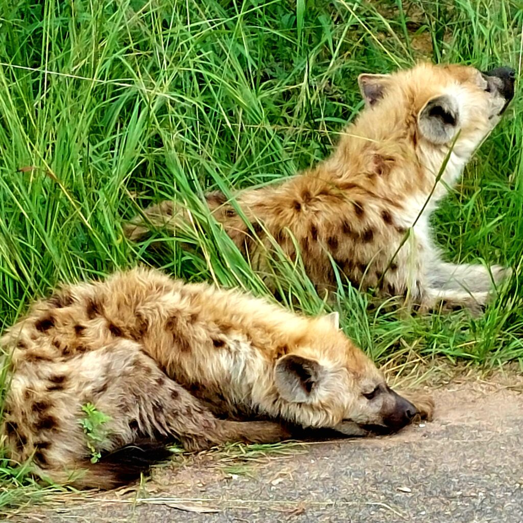 På flera ställen utmed vägkanten ser vi en hel del hyenor med sina ungar. De är ju så jättegulliga. Den vanligaste arten är fläckig hyena i Krugerparken.