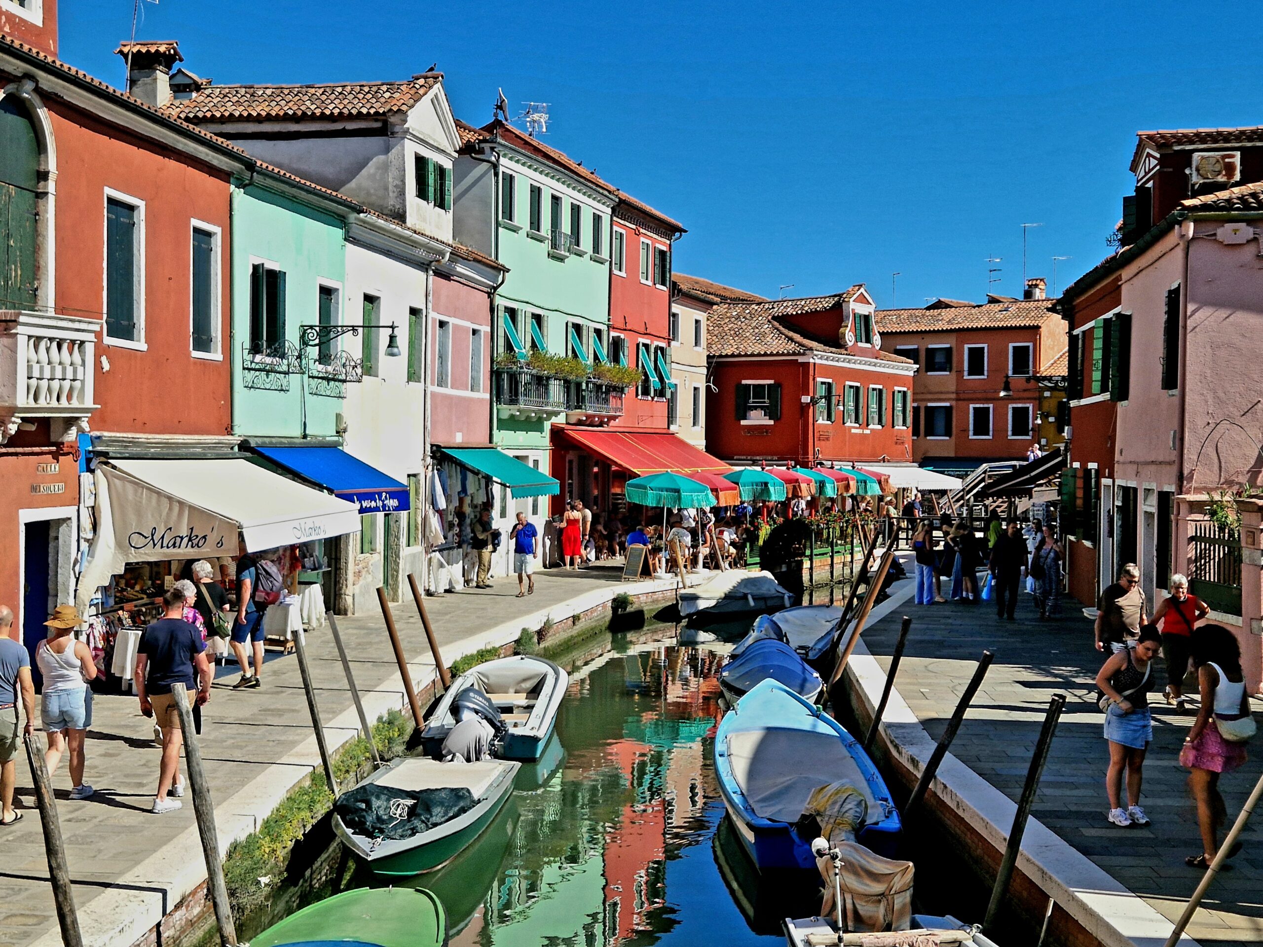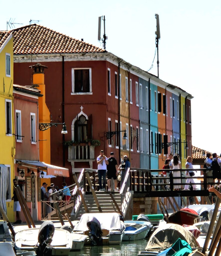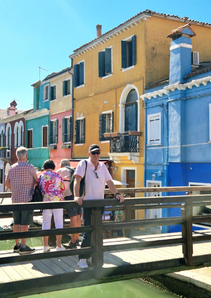 Trots att vi är många turister denna soliga septemberdag känns det inte lika trångt som inne i Venedigs smala gränder. På vissa platser är det förstås en hel del folk som vill fotografera och bli fotograferade, särskilt vid broarna som sträcker sig över kanalerna som löper genom ön.