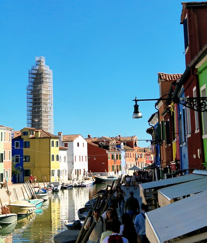 Mitt på ön ligger det karaktäristiska klocktornet vid Chiesa di San Martino, det är känt för att det lutar lite lätt, något som ger Burano ytterligare charm. Just nu är tyvärr kyrktornet under restaurering och täckt av byggnadsställningar och plast, vilket gör att vi inte riktigt kan föreställa oss den i sin helhet.