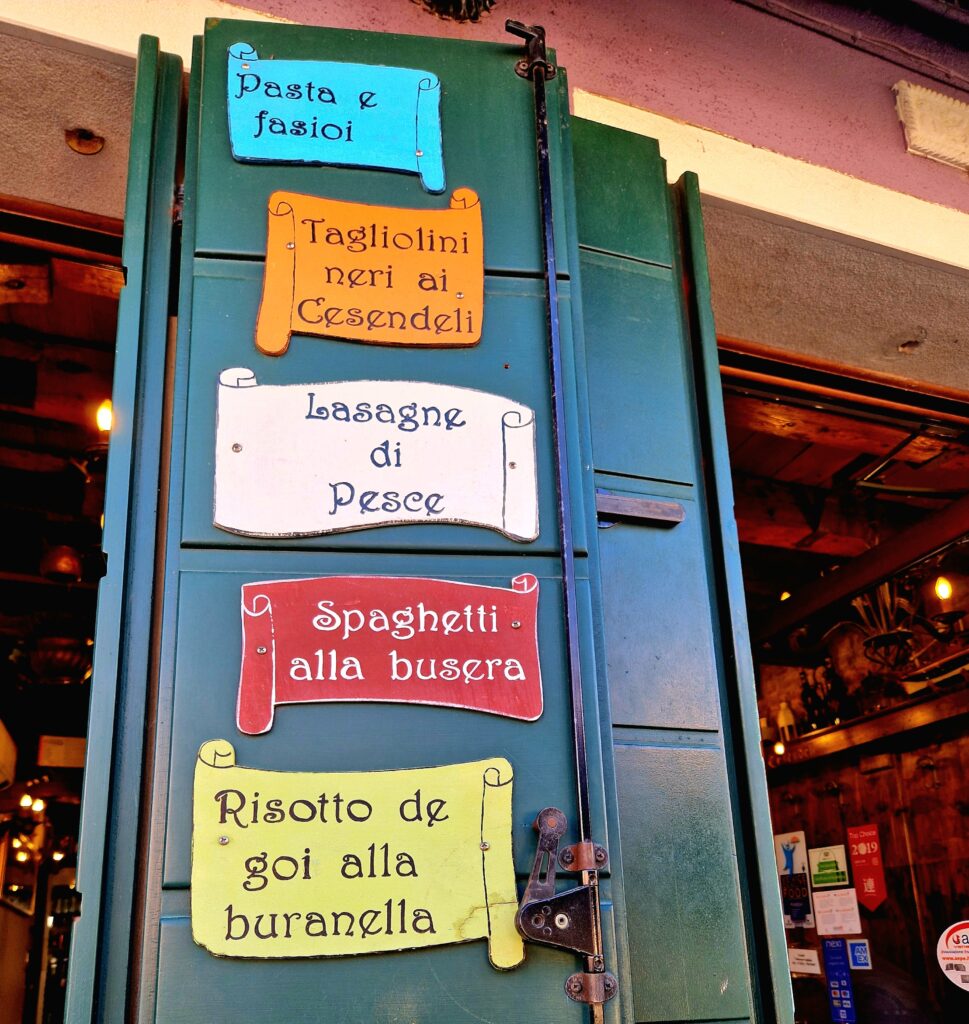 Längs huvudgatan Via Galuppi ligger restauranger som serverar färsk fisk och skaldjur, men det finns även de klassiska italienska rätterna med lasagne, spaghetti och risotto. Själva stannar vi till vid en av dem och äter en bit lunch. Ett besök här handlar inte bara om färger utan också om smaker. Fisk och skaldjur dominerar menyerna, ofta fångade i närområdet.