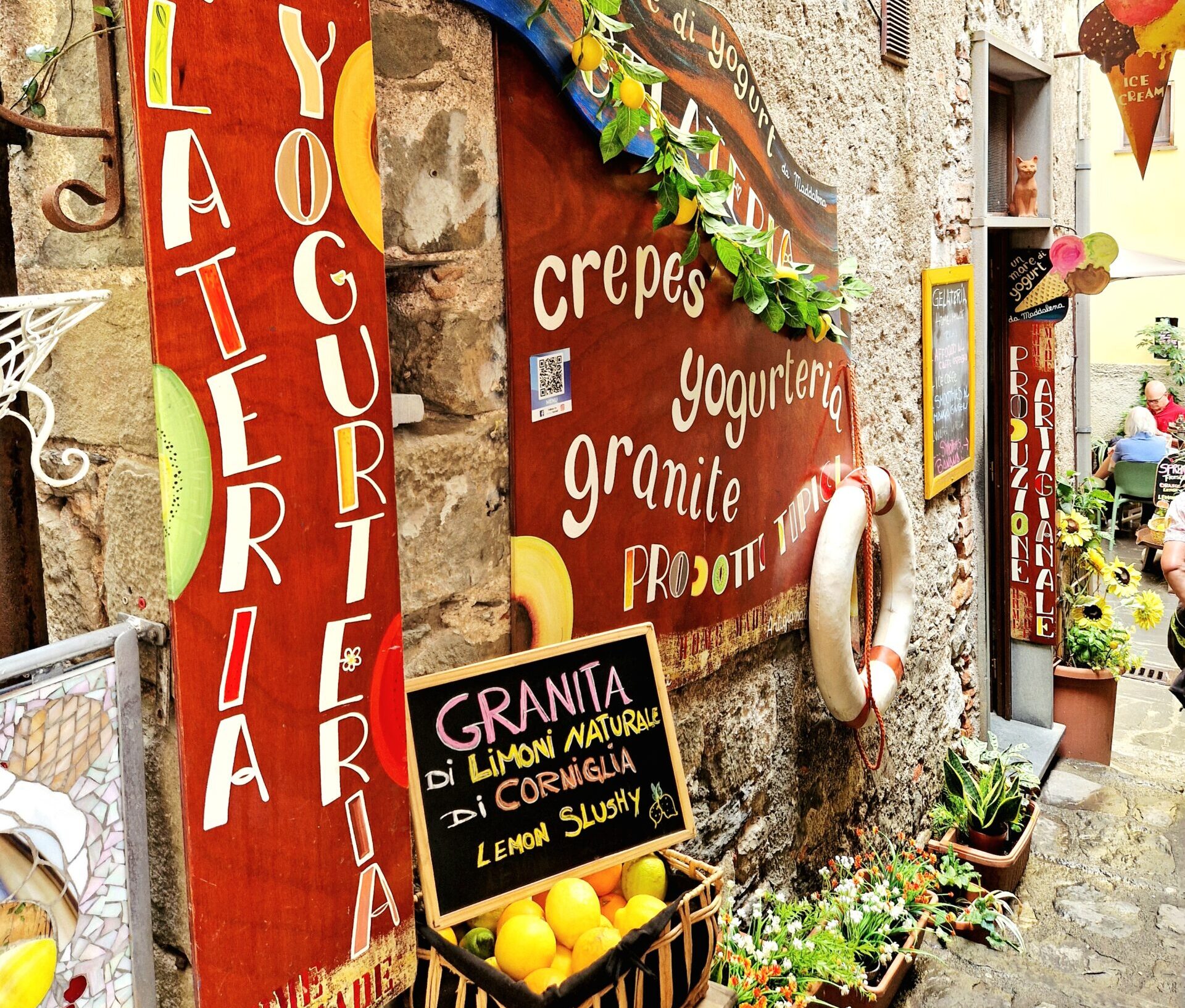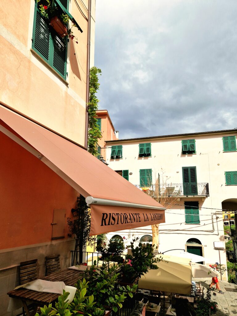 Mitt i byn finns små torg där lokalbor och vi besökare kan sätta oss ned vid ett café för att njuta av atmosfären en liten stund. Gatorna är stenlagda och slingrar sig mellan husen. Det är förhållandevis ganska många restauranger och caféer i Corniglia men de fylls ändå på ganska fort nu när vi är här vid lunchtid.