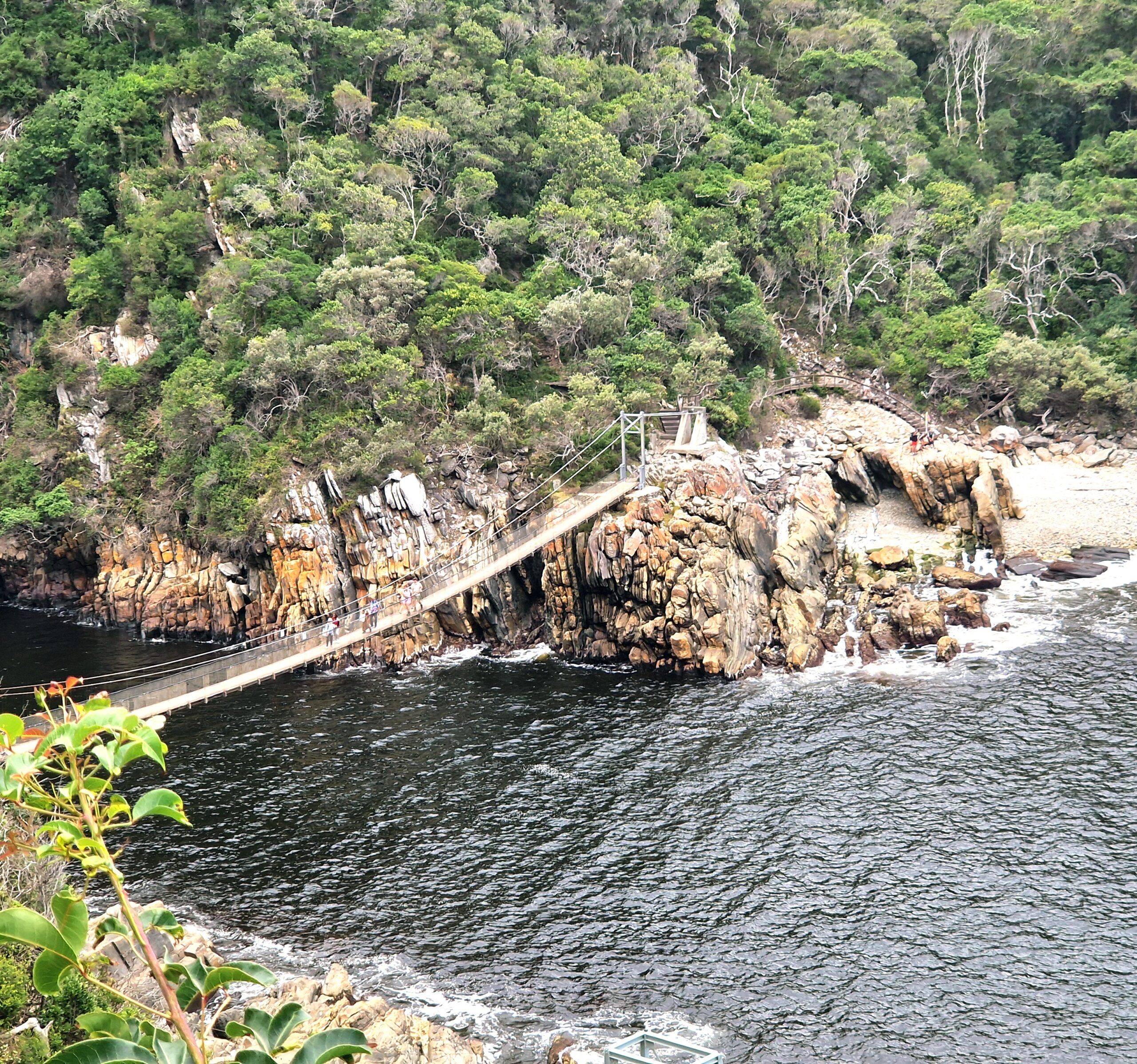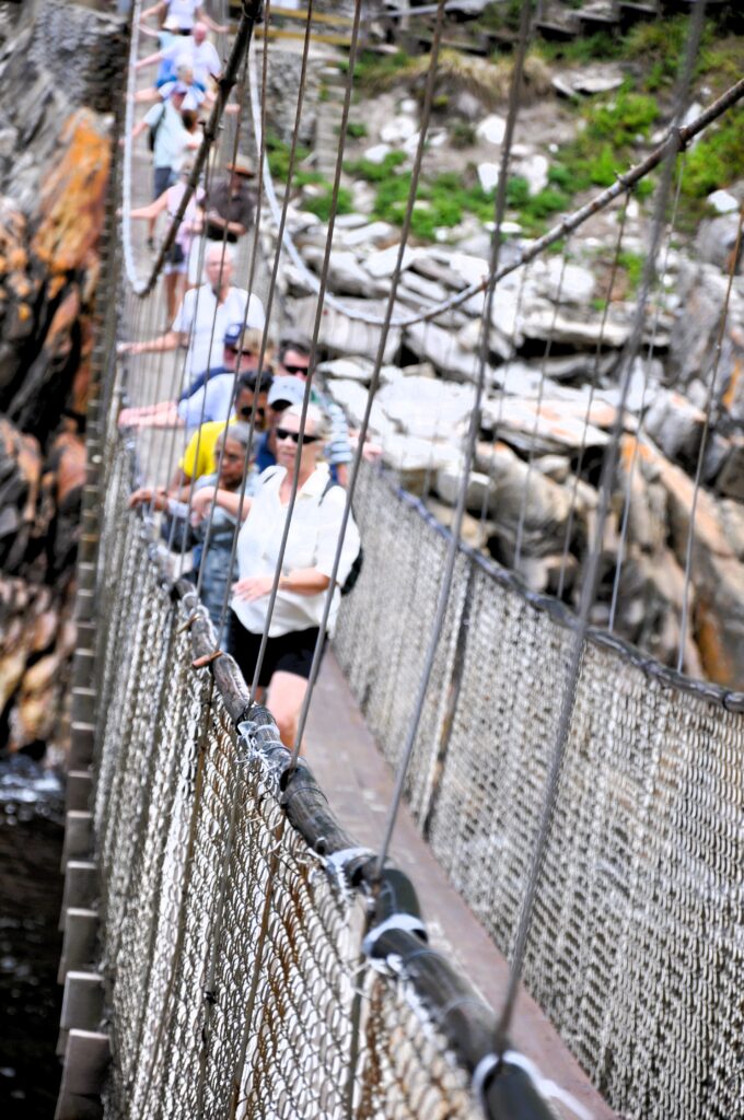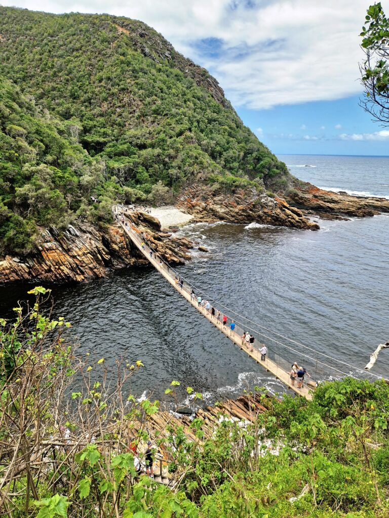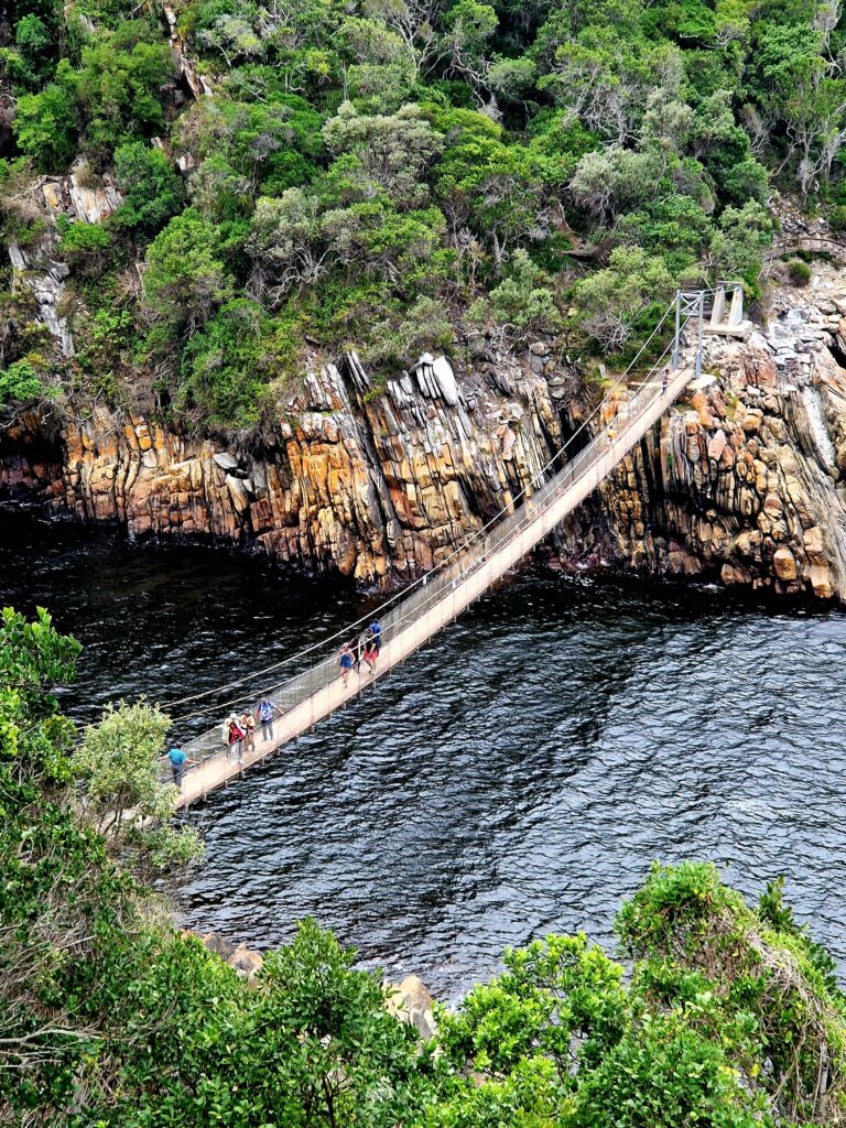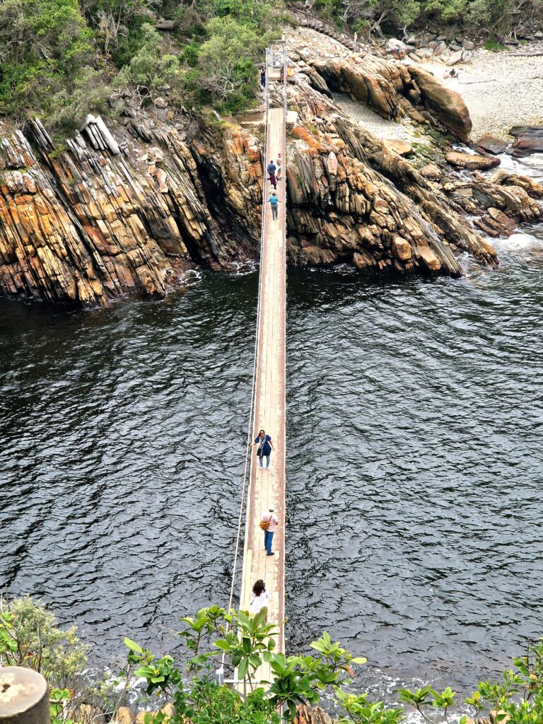 Snart kan vi se den häftiga hängbron vid Storms River Mouth. Det är den mest ikoniska och också den största av de tre broarna över ravinen. Bron är ungefär 77 meter lång och hänger högt över Storms River, vilket ger en imponerande utsikt över floden och den omgivande kustskogen.