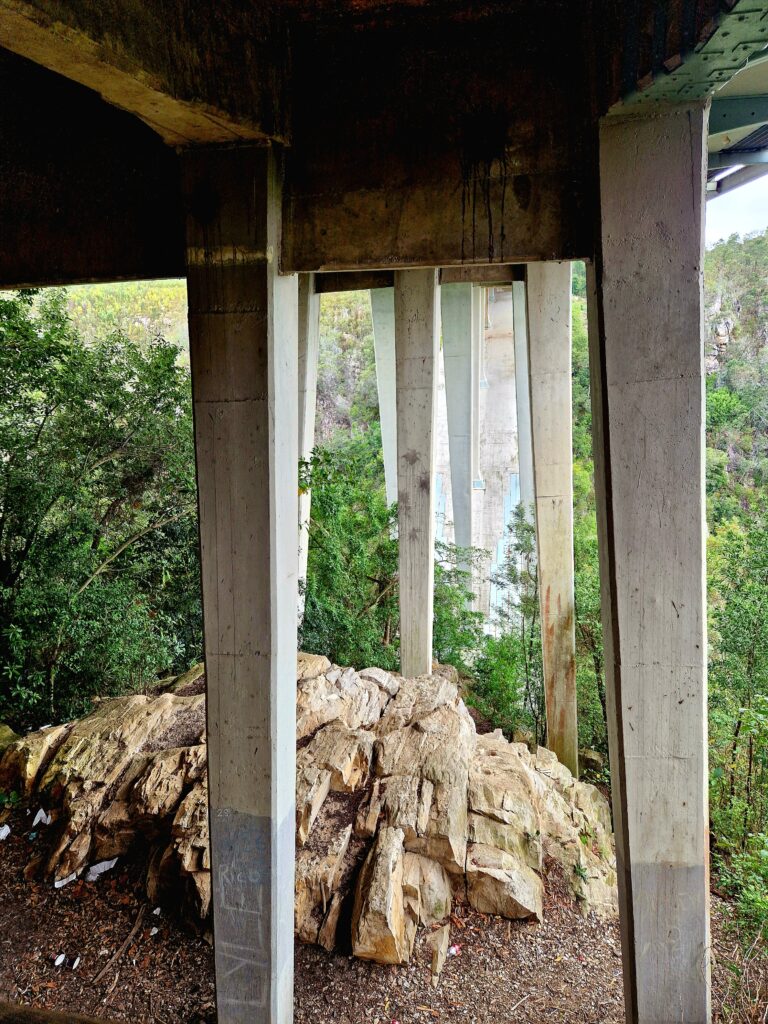 I dag är den inte bara en viktig transportlänk utan också ett populärt stopp för oss turister som reser längs Garden Route. Det är faktiskt lite svindelkänsla när vi tittar ut från mitten av bron ned över ravinen. Det är också lite läskigt att stå här på bron eftersom väldigt tung trafik kör i hög fart knappt någon meter från oss gångtrafikanter.