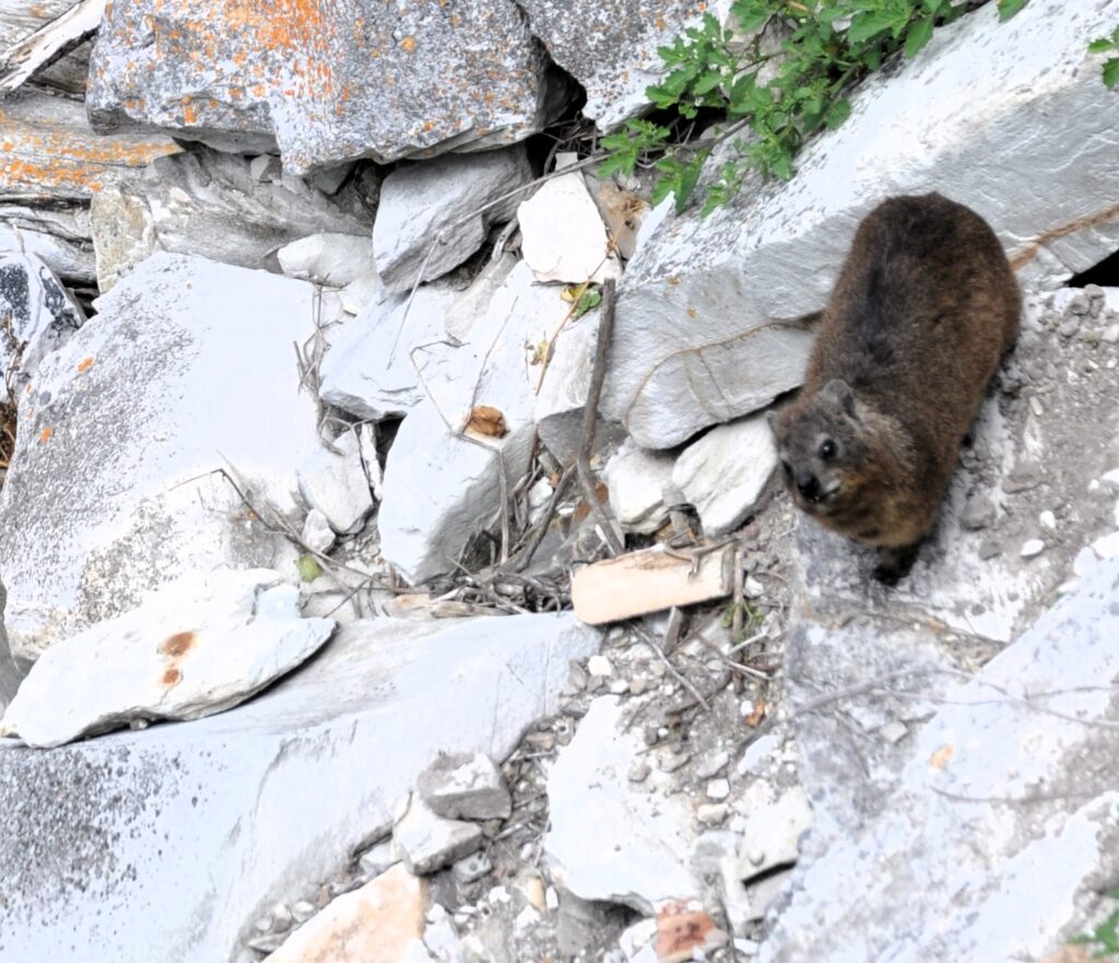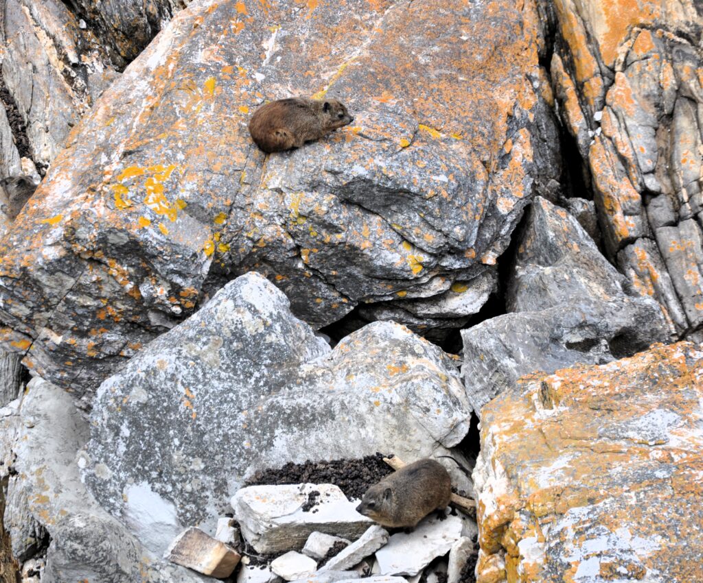 På flera av klipporna kan vi se de små och söta djuren som är Klippdassar eller rock hyrax som de heter på engelska, kallas ofta för “dassies” i Sydafrika. De sitter gärna i solen på varma stenar och håller utkik efter rovdjur, samtidigt som de snabbt kan gömma sig i sprickor om de blir skrämda.