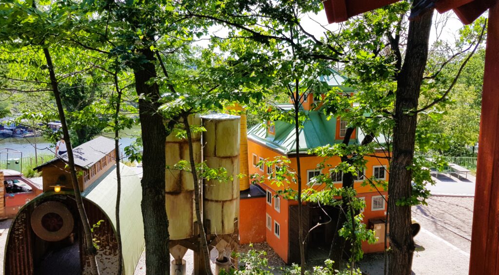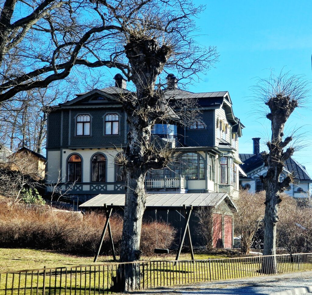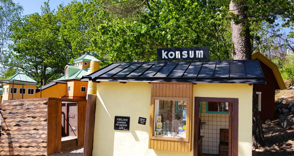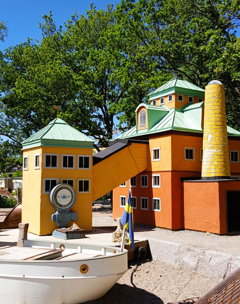 När vi ändå är i Nacka måste Lilla Kvarnholmens lekplats nämnas. Nu är det ett par år sedan vi var här men en sommardag 2019 tog vi våra två barnbarn, Ingrid och Philip med oss hit. De var då sex och drygt tre år gamla och de älskade parken. Det är en lekplats med små hus som barnen kan gå in i, och hela miljön är uppbyggd som ett litet samhälle i miniatyr, kanske inspirerat av Kvarnholmen. Parken ligger dessutom i en sluttning med fin utsikt över vattnet,