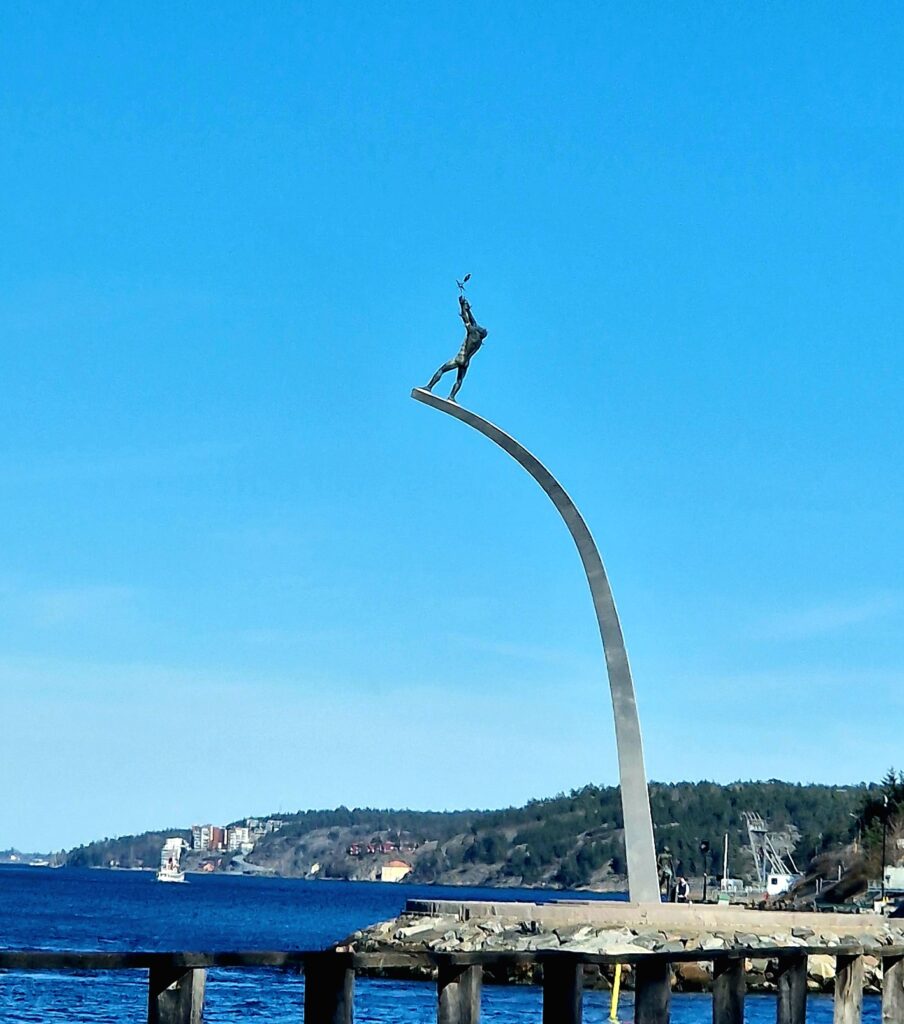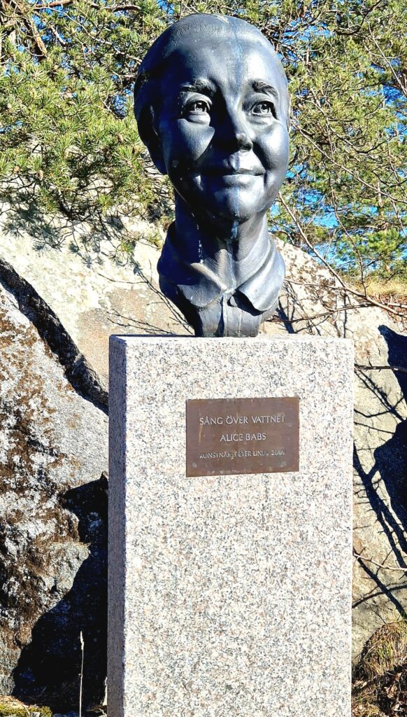 Innan vi lämnar Saltsjöbaden tar vi oss förstås en promenad utmed hamnen och en bit ut mot vattnet. På tillbakavägen ser vi en staty av Alice Babs. Hon bodde här i Saltsjöbaden under en stor del av sitt liv och är nu hedrad med en staty som står fint placerat utmed fjärden.