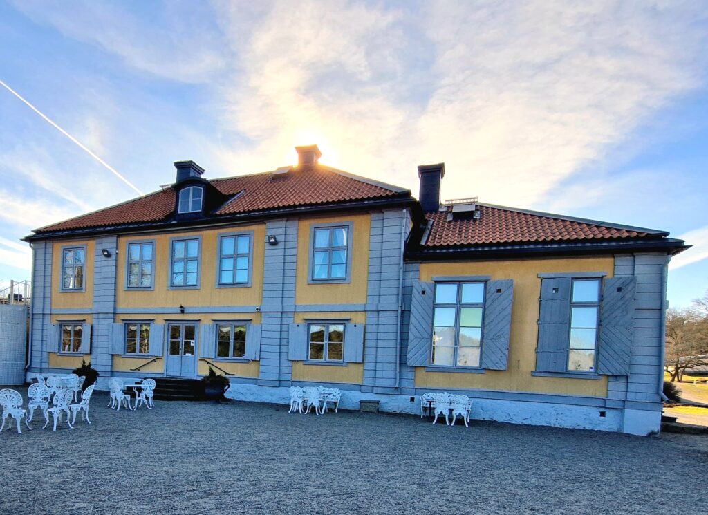 Däremot är caféet öppet och ute i trädgården är alla platser upptagna. På herrgårdens baksida är det dock ingen sol men en varm sommardag kan det nog vara skönt att sitta även här.
