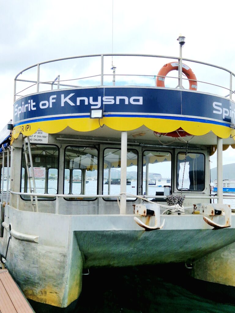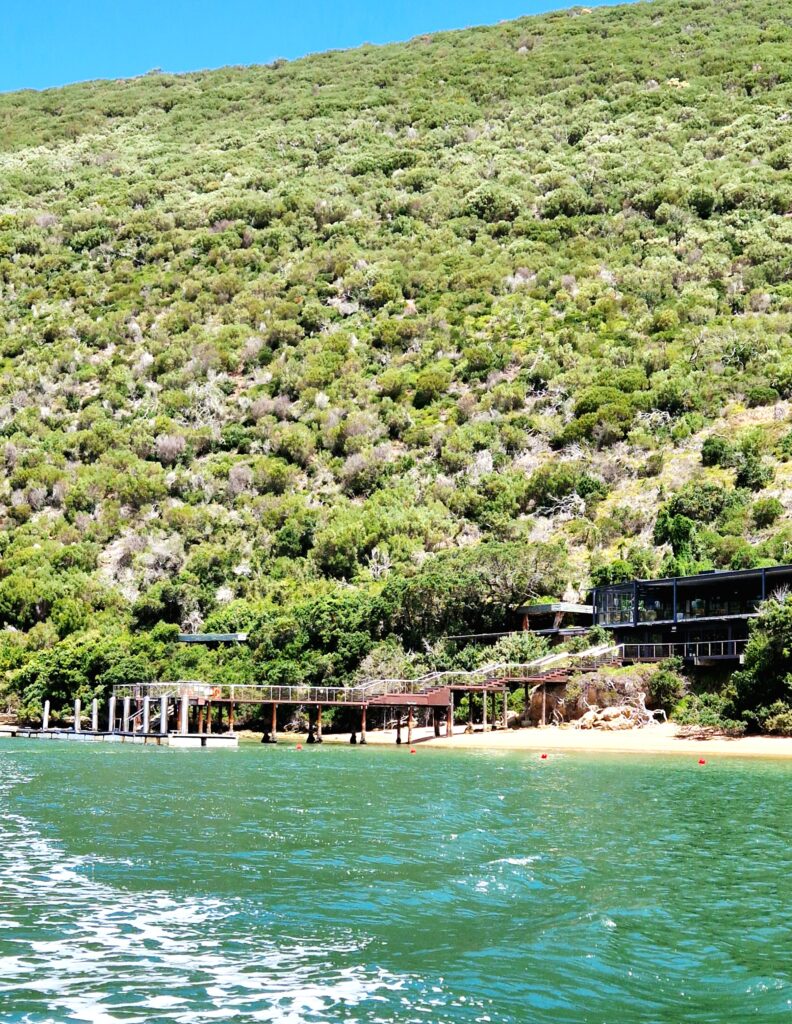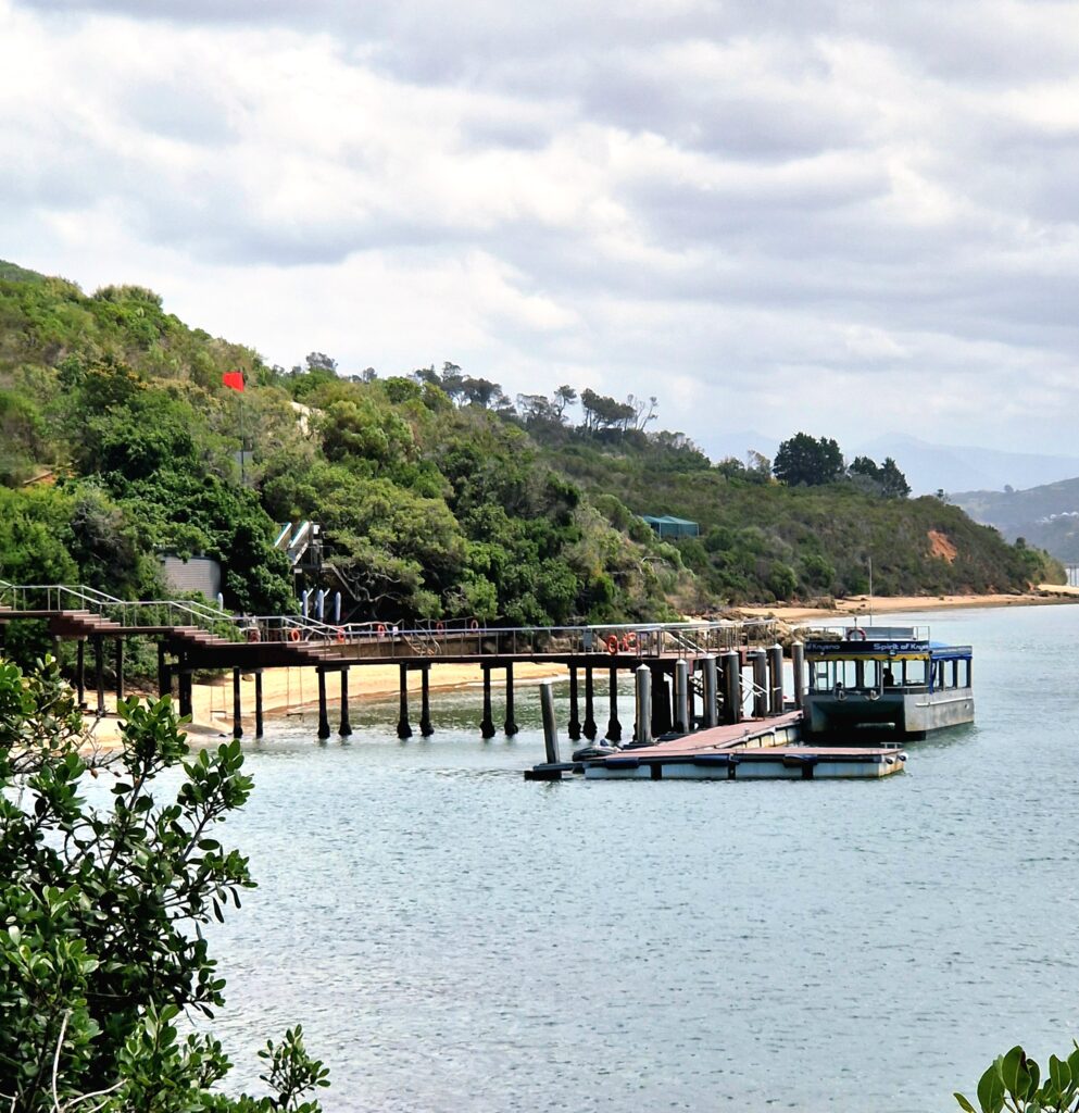 Ganska nära vårt hotell i Knysna ligger hamnen och båten som ska ta oss till naturreservatet mitt över lagunen. Reservatet ligger på en halvö och är bara tillgängligt med båt. Båtturen tar knappt en halvtimme och vi har en lokal guide som följer med på hela turen. Dels guidar han på båten men också på turen uppför till toppen av berget där vandringen tar sin början för att åter ta oss nedför via en vandringsstig.