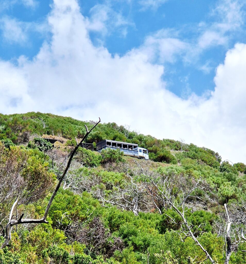 För att ta oss vidare går vi en kort promenad till den väntande transporten som tar oss vidare upp på höjderna. Vill man, kan man givetvis promenera hela vägen, men det känns ganska onödigt och tar säkert en bra stund då det lutar rejält brant uppför.
