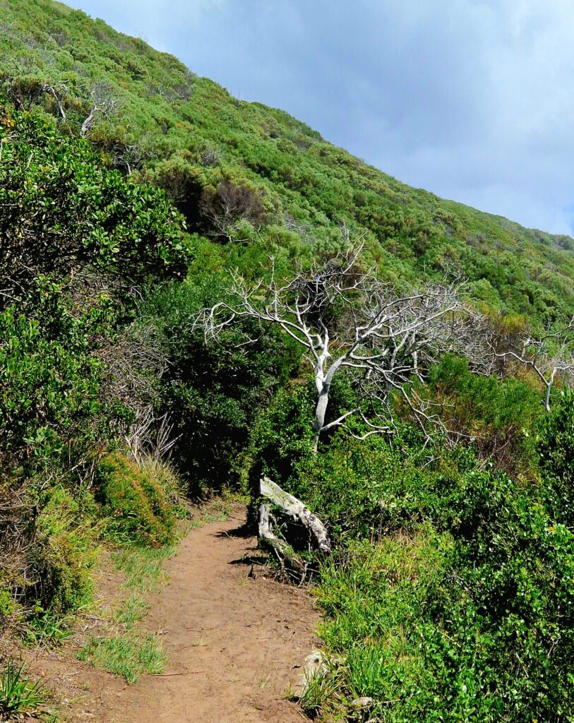 Efter en långsam vandring ned mot stranden på cirka en timme når vi den sista delen som går på delvis spångad väg och gräsbevuxna stigar. Här och var finns det även möjlighet att ta sig ut mot stranden, om man vill ta sig ett dopp. Vi fortsätter en bit alldeles intill strandremsan innan det åter går lätt uppför och där vi snart ser entrén och restaurangen till naturreservatet.