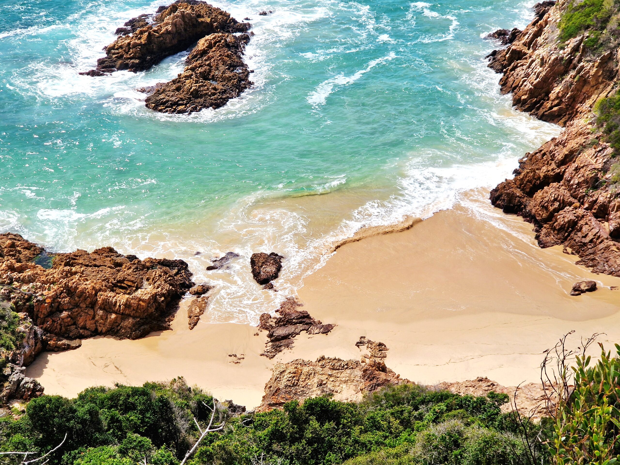 Även om vyerna är fantastiska uppe från toppen blir det ännu mer storslagna utsikter ju längre ner vi kommer. Vi kan se hur vattnet slår mot klipporna och det finns små sandstränder inkilade mellan klippblocken i grönskan.