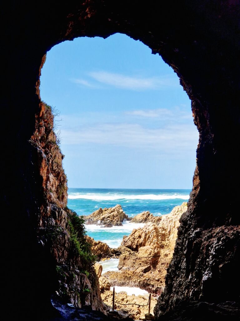 På väg ned mot klipporna och havet slår vågorna från Indiska oceanen hårt mot oss. Nej, det är inte läge att försöka ta sig ut genom grotthålet.