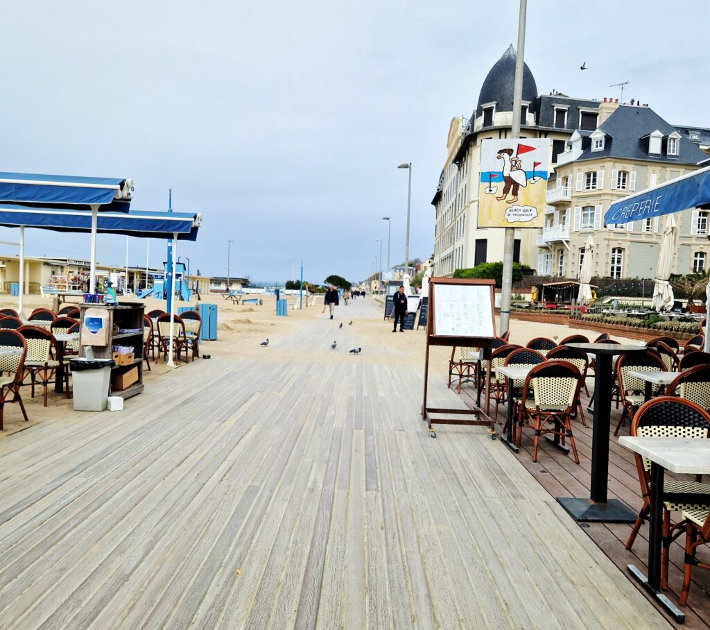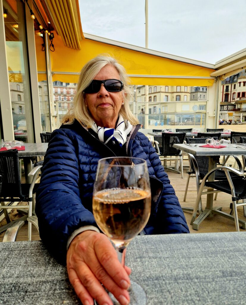 På stranden i Trouville-sur-Mer är det eftermiddagsfika med ett glas rosé.