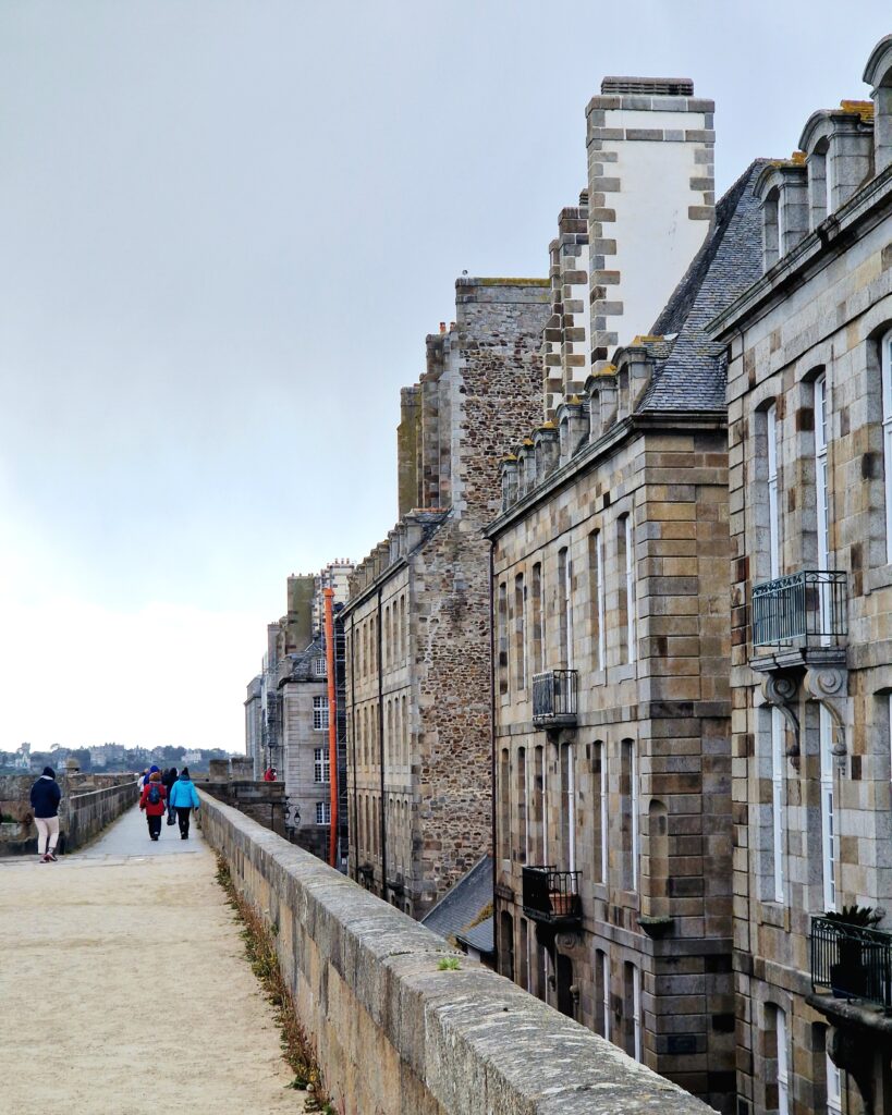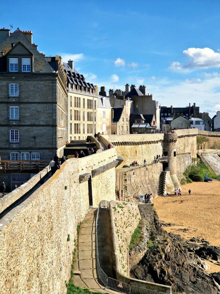 I Saint Malo gör vi en övernattning, men det är inte det lättaste att köra runt i de smala gränderna innanför stadsmuren där jag bokat hotell. När vi väl hittar vårt hotell, precis innanför stadsmuren i den gamla stadskärnan, är det bara att kliva ut och promenera längs murarna som omger staden. Vädret skiftar snabbt, från några stänk av regn till strålande sol, typiskt aprilväder.